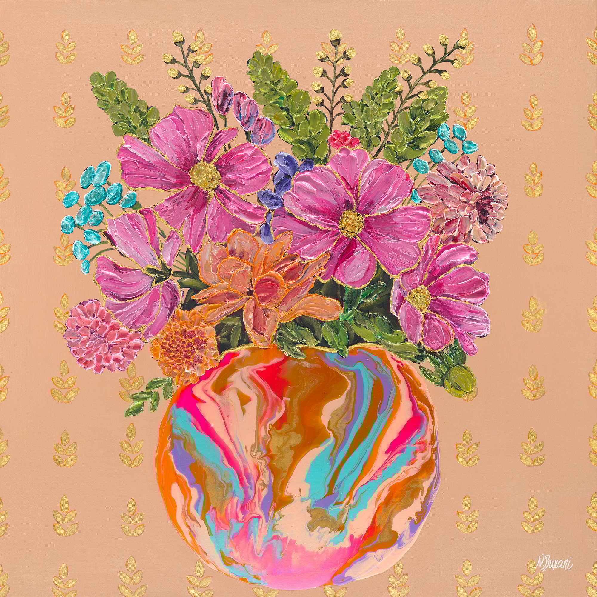 Neena Buxani is an Indian-American artist who was raised on the border of Mexico in Brownsville, Texas. She currently resides in Austin, Texas with her husband and two boys. Neena has a B.S. in Advertising and Speech Communications and an M.S. in Social Work from the University of Texas at Austin, as well as a Gemological Certification from GIA. She has worked as a substance abuse counselor, jewelry buyer, loan officer, jewelry store owner and general manager for a hotel. Her multifaceted background and multicultural upbringing has helped to shape her vision as a self- taught artist.