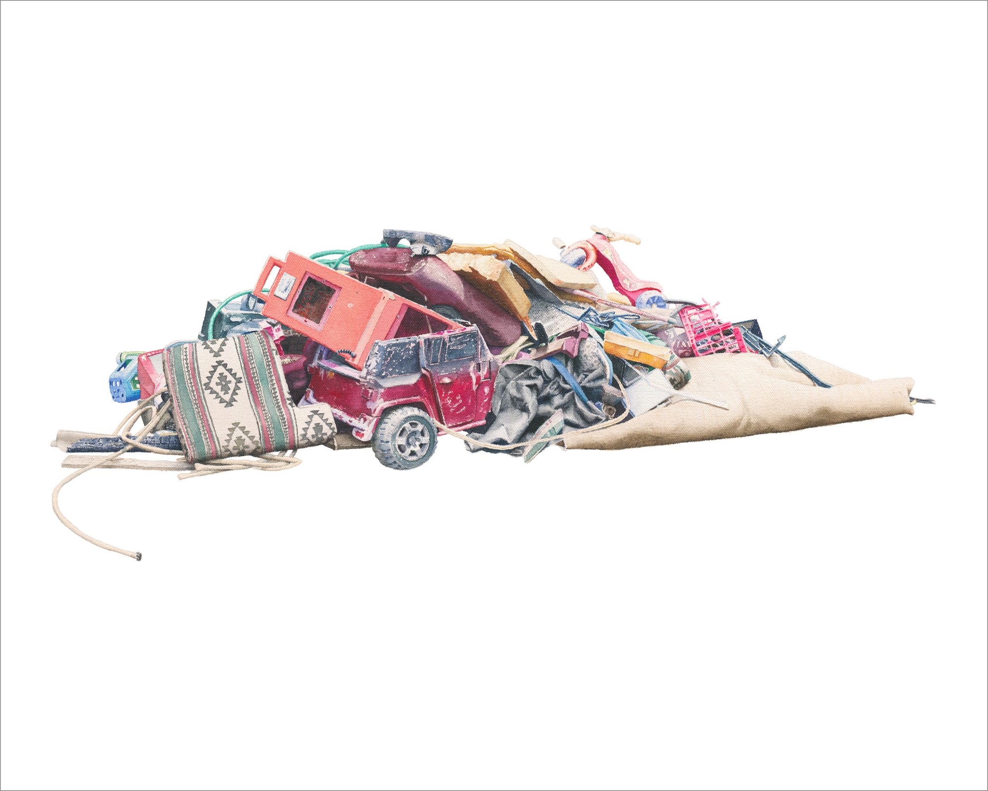 For the past decade, Jason has made paintings of Austin’s residential bulk trash as part of an ongoing series titled ‘Discard Piles’. A few hours each week he drives the city’s neighborhood streets searching for the crème de la crème of trash piles. They are documented photographically, exactly as found without alteration to their arrangement. Back in his studio, select piles are intricately painted using water-thinned acrylics against empty white backgrounds. Collectively and individually, these paintings hold open space for contemplating the unknown stories of other people’s lives; the power and seeming necessity of purging; the environmental impact of disposable culture; and the uncanny beauty of dereliction.