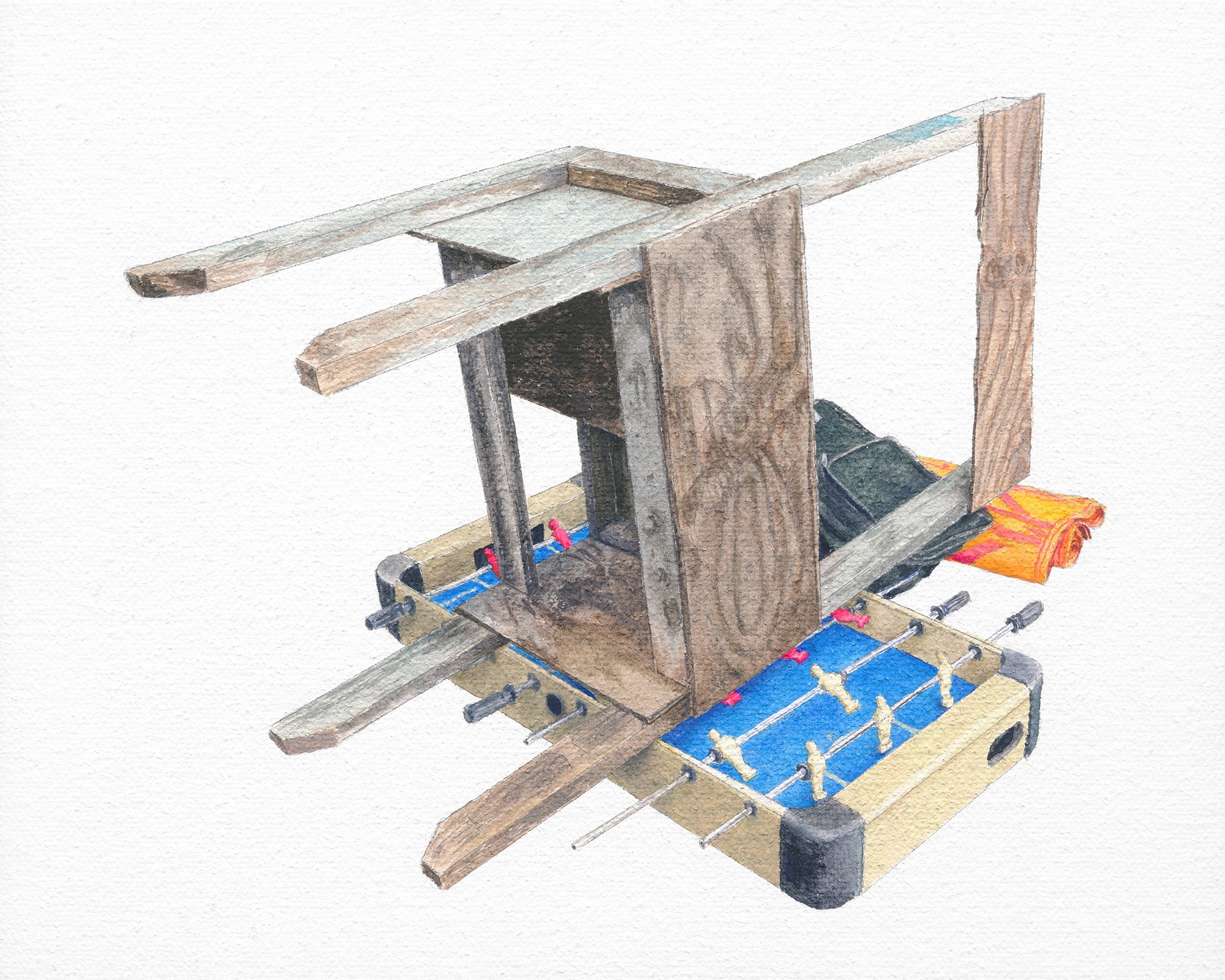 For the past decade, Jason has made paintings of Austin’s residential bulk trash as part of an ongoing series titled ‘Discard Piles’. A few hours each week he drives the city’s neighborhood streets searching for the crème de la crème of trash piles. They are documented photographically, exactly as found without alteration to their arrangement. Back in his studio, select piles are intricately painted using water-thinned acrylics against empty white backgrounds. Collectively and individually, these paintings hold open space for contemplating the unknown stories of other people’s lives; the power and seeming necessity of purging; the environmental impact of disposable culture; and the uncanny beauty of dereliction.