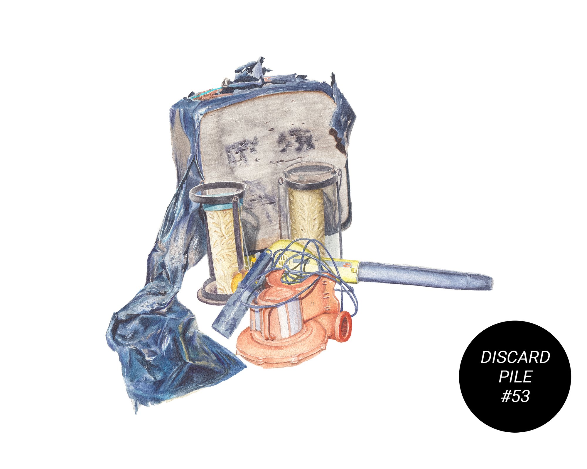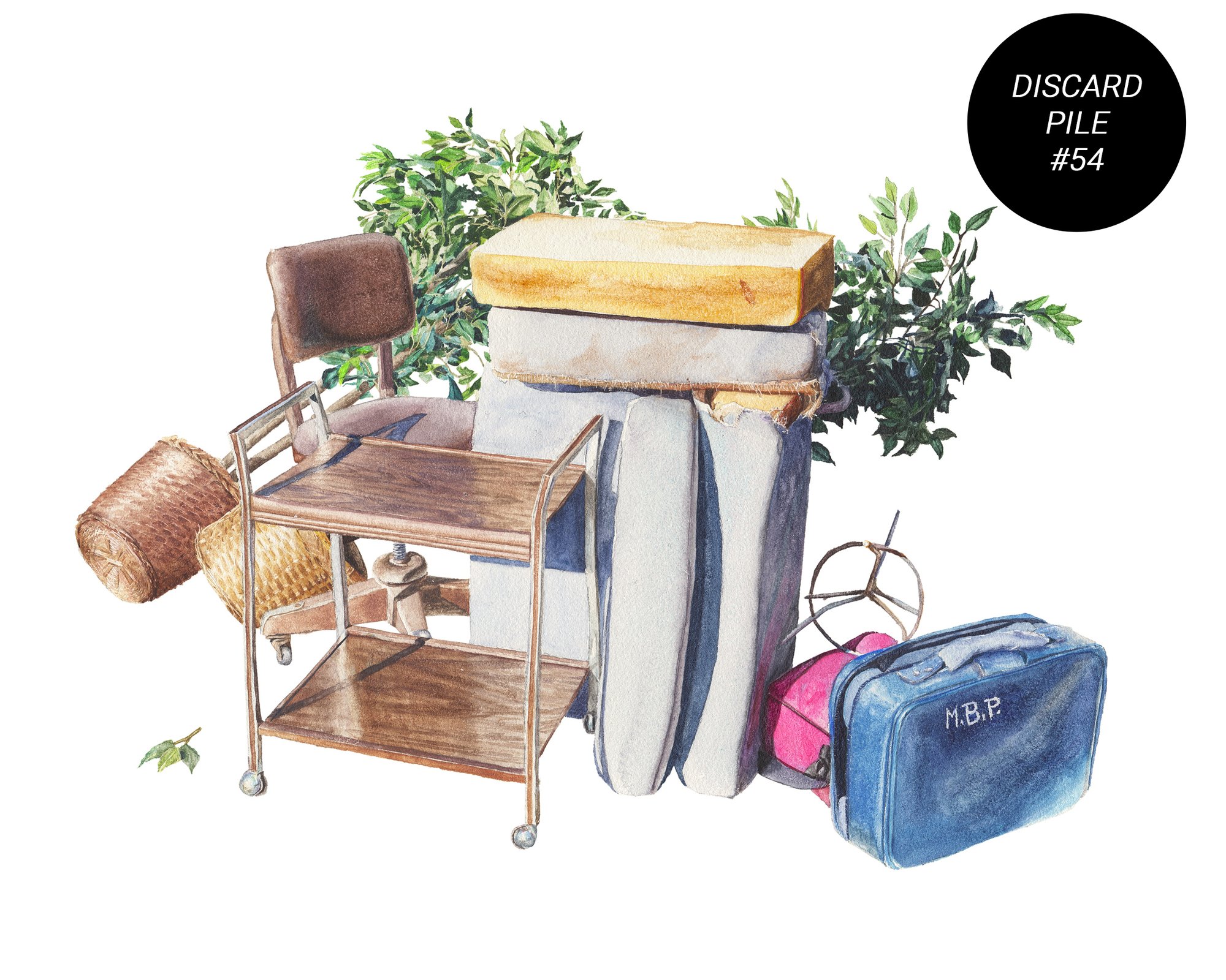 For the past decade, Jason has made paintings of Austin’s residential bulk trash as part of an ongoing series titled ‘Discard Piles’. A few hours each week he drives the city’s neighborhood streets searching for the crème de la crème of trash piles. They are documented photographically, exactly as found without alteration to their arrangement. Back in his studio, select piles are intricately painted using water-thinned acrylics against empty white backgrounds. Collectively and individually, these paintings hold open space for contemplating the unknown stories of other people’s lives; the power and seeming necessity of purging; the environmental impact of disposable culture; and the uncanny beauty of dereliction.
