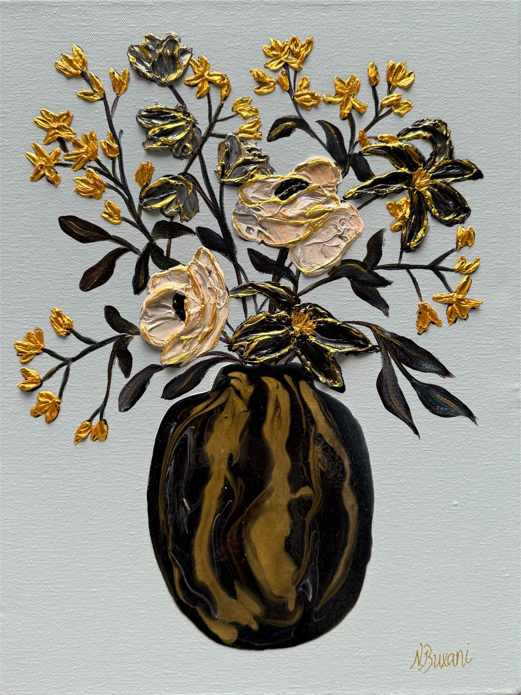 Neena Buxani is an Indian-American artist who was raised on the border of Mexico in Brownsville, Texas. She currently resides in Austin, Texas with her husband and two boys. Neena has a B.S. in Advertising and Speech Communications and an M.S. in Social Work from the University of Texas at Austin, as well as a Gemological Certification from GIA. She has worked as a substance abuse counselor, jewelry buyer, loan officer, jewelry store owner and general manager for a hotel. Her multifaceted background and multicultural upbringing has helped to shape her vision as a self- taught artist.